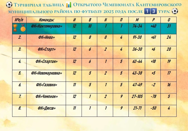 17.08.2025 года состоялись игры 13 тура Открытого Чемпионата Кантемировского муниципального района по футболу 2025 года с участием команд МКУ ДО «ДЮСШ». Результат игры на стадионе СК «Спартак» с.Митрофановка: ФК «Спартак» (Митрофановка)7:3 ФК «Чемпион»(Митрофановка). Результат игры на стадионе с.Новомарковка: ФК"Новомарковка"(Новомарковка)5:1 ФК"ДЮСШ"(Кантемировка).